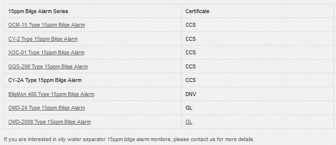 15 ppm Bilge Alarm Monitor serves to continuously measure the concentration of oil in the bilge and other waste water produced on a ship, and produces an alarm signal when the oil concentration exceeds 15 ppm.