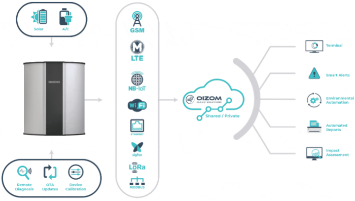 Odosense Solution is designed with an ultra-modular approach to accommodate any existing infrastructure. For power, Odosense can work on External AC or DC power as well as Solar Power. For data transmission, Odosense can communicate the data using various Wired and Wireless channels. GSM, GPRS, 3G, WiFi, LORA, LTE, SIGFOX are available for wireless data communication. Where Ethernet, Modbus, RS-485, RS-283 are the wired data-communication options. The odour data monitored by Odosense can be transmitted to Oizom Cloud which can be hosted on Shared or Private Infrastructure. The data from Oizom Cloud can be served for different data-solutions based on end-application.