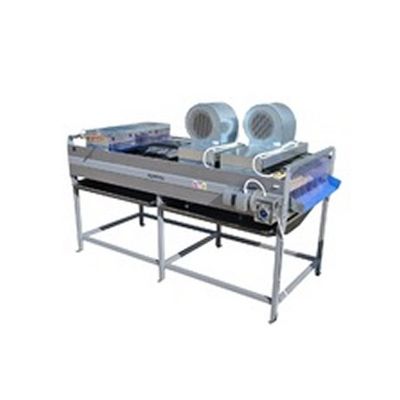 The products enter at the beginning of the machine where they are washed/brushed/dried. This is done in the washing section, where the sprinkler system (water, foam or other disinfectant, depending on the product processed) works with the brushing system underneath it. In the draining system, the rotating sponges in collaboration with the turbines, drain the processed product. The sponges are squeezed by a straining system located underneath them. Under the upper level, the drainage system, consisting of two tanks, drains the excess water and objects.