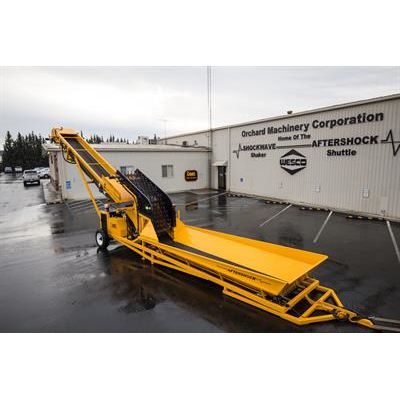 The Aftershock SD-36 Series II elevator works in tandem with a side-dump shuttle such as the OMC Aftershock AR-400, providing the operator with quick and efficient transfer of collected product from the shuttle and into the trailer. Two 36-inch-wide belts haul the product up to a height of 14 feet 6 inches, while an optional de-sticker and cross conveyor remove sticks and twigs from your product, ensuring your trailer capacity is maximized with nettable product. The SD-36 elevator is operated from a swingarm-mounted platform accessible from the cab of the AR-400 shuttle, ensuring operator safety and reducing fatigue.