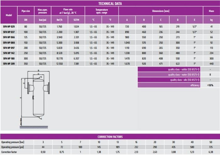 SFH HP welded high pressure condensate separators are designed for high efficient removal of bulk liquids and large impurities from high pressure compressed air systems up to 50 bar. The insert inside the housing creates controlled rotation of the air flow. Centrifugal flow of liquids (water, oil) and large particles is forced to the housing wall, slowed down and accumulated at the bottom of separator housing as condensate. The turbulent free zone in the lower part of the cyclone housing prevents condensate from being picked up and “carried over” into the airstream. To discharge condensate from the SFH HP cyclone separator it is essential to install automatic or electronic condensate drain.