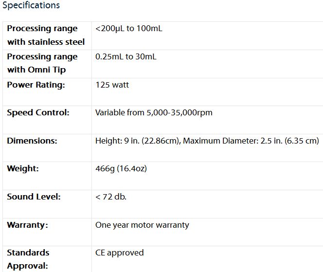 The redesigned Omni TH is a powerful Tissue Homogenizer designed to handle a wide range of laboratory samples from 0.2 mL to 100 mL in volume. The TH can usually process a tissue sample in less than 30 seconds and is compatible with a wide variety of generator probes for flexibility in application requirements. The Omni TH will accommodate a wide range of lab applications such as tissue homogenization, emulsions and suspensions, cell disruption, protein extraction and medical research. It is lightweight enough to be hand-held and can also be mounted to a motor stand for lengthier processing.