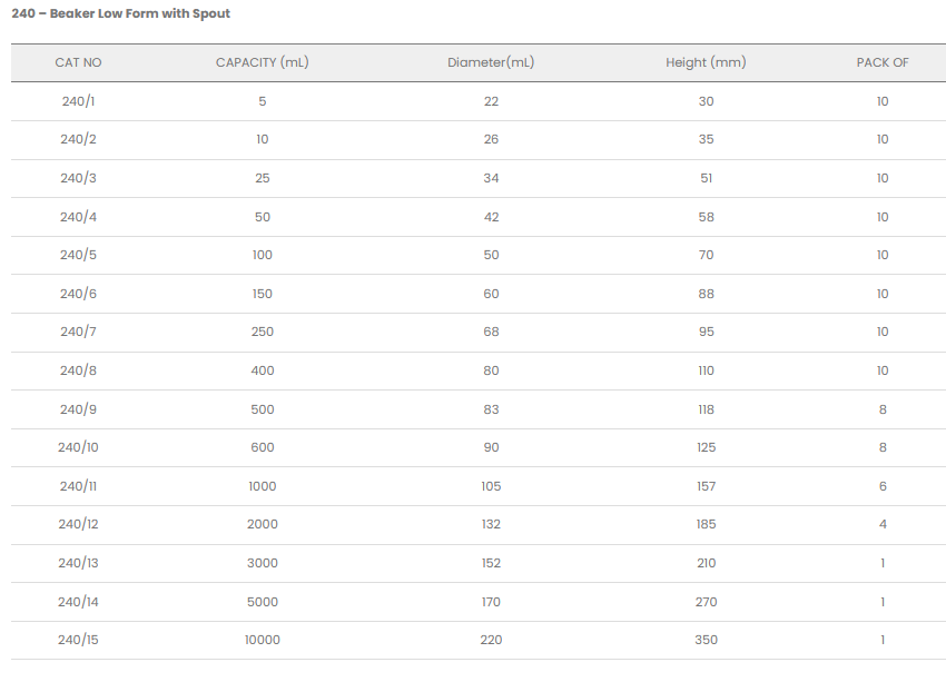 240 – Beaker Low form with Spout: Made from high-quality Borosilicate 3.3 Glass. Uniform wall thickness & Ideal for heating liquids. Clear Metric Graduation for convenience. Highly resistant to chemical attack.
