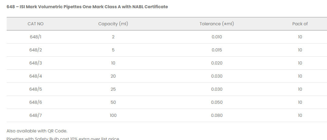 648 – ISI Mark Volumetric Pipettes One Mark Class A with NABL Certificate: Compliance with IS:1117 Standards. Class ‘A’ with NABL Certificate. Each pipette is colour coded with unique identification number. Generally used for accurate measurement of liquid. Calibrated and certified at 27°C. alibrated for delivery (TD, Ex).