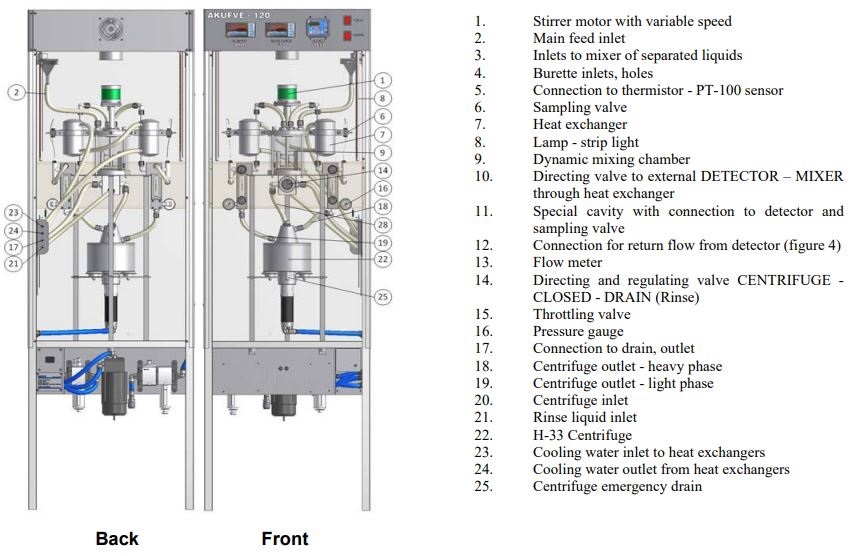 The AKUFVE-120 instrument is used for measuring partition factors and process dynamics in solvent extraction. It consists of: