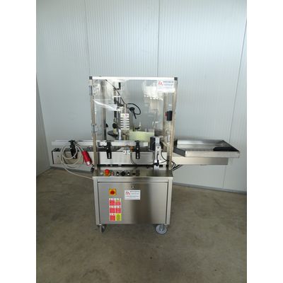 One station adhesive Labelling machine for label and back on the same roll, electronic adjustable for distance label/back, for to apply label on back label on round bottle, thermo-shrinkable capsules with thermic head.