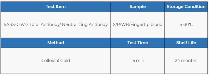 Test Item: Total Antibody/ Neutralizing Antibody. Sample Type: Serum/Plasma/Whole Blood/Fingertip blood. Test Time: 15 min. Methodology: Colloidal Gold.