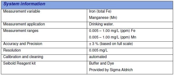 This Instrument was developed and built for Drinking Water Industry. Drinking water. Iron may be present in drinking-water as a result of the use of iron coagulants or the corrosion of steel and cast iron pipes during water distribution. There is usually no noticeable taste at iron concentrations below 0.3 mg/litre, and concentrations of 1–3 mg/litre can be acceptable for people drinking anaerobic well water. Manganese is naturally occurring in many surface water and groundwater sources, particularly in anaerobic or low oxidation conditions. A provisional health-based guideline value of 0.5 mg/litre should be adequate to protect public health.