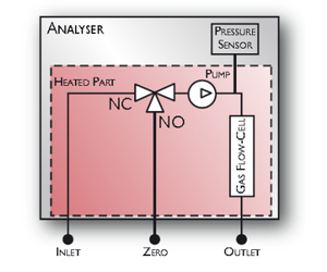 Inlet and zero are connected on a 3 ways electric valve. When the automatic zero is activated, the solenoid valve switches the flow cell on zero air. A pressure sensor takes the pressure of measured gas to compensate it and to give a flow indication. All the gas circuit is in a heated compartment controlled within +/- 0.5 °C at an adjustable temperature between 40°C and 240°C. An optional pump may be included before the gas flow cell in order to pump the sample as well as the zero gas that may be ambiant air for most of the applications.