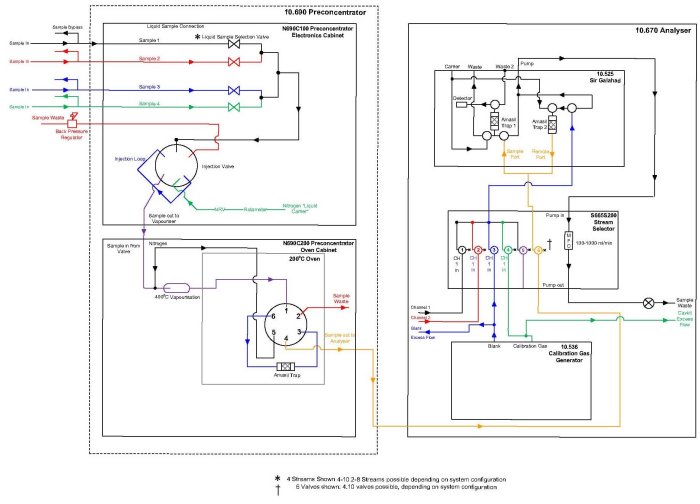 Once a sample stream has been selected for analysis, a flush period is allowed to ensure that a representative sample is present in the injection loop. The sample is then injected into the Preconcentrator Vapourisation chamber in a stream of nitrogen carrier gas. The vapourised sample is passed over an AmasilTM trap located in a 200°C oven, where mercury in the sample is amalgamated onto the gold coated trap. The vapourised organic material passes over the trap and outg to waste via the sample waste port.
