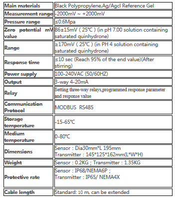 POP-500 ORP sensor is a combination electrode combined precious metals indicator electrode with reference electrode. Firstly measure the potential difference of working battery made up of measuring electrode and reference electrode in the solution,then use linear relation of ORP value of the measuring solution and potential of working battery to realize the ORP on-line monitoring.