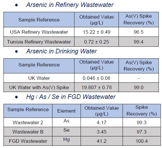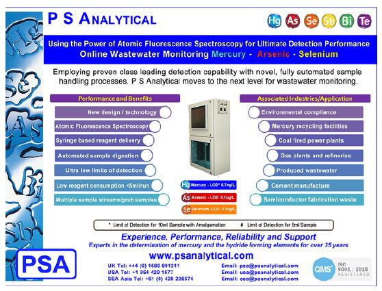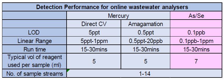 Online wastewater analysis for the determination of Mercury (Hg), Arsenic (As) & Selenium (Se), at trace concentrations, using Atomic Fluorescence Spectrometry. Hg, As & Se are considered environmental priority pollutants and the determination of these metals in wastewater from industrial sources is a challenging application. In recent years wastewater treatment plants have been installing technologies to capture and remove the metals. The efficiency of these treatment processes needs to be monitored using accurate analytical systems.