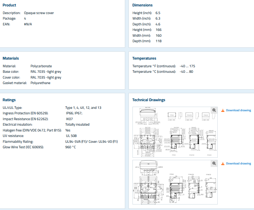 Part #: 7520280. Dimensions: 6.5 x 6.3 x 4.6 inches. Ratings: UL Type Type 1, 4, 4X, 12, and 13: IP66; IP67;; IK07.