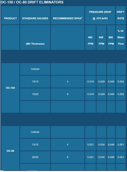 The OC-80 is a high efficiency cellular drift eliminator for counter-flow cooling tower applications. The OC-80 is manufactured from rigid, corrugated PVC sheets resistant to UV, rot, fungi, bacteria, organic/inorganic solvents, acids, alkalis, and chemicals normally found in cooling tower waters.