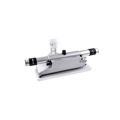 Two prisms are mounted at the two ends of the measurement base and deviate the optical axis according to the two sides of the right-angled triangle. Two equal objectives arranged on the axis of the instrument report the respective images of the object to a central prism which houses the two separate images and reports them in single ocular. The field of the ocular is divided into two separate parts, each corresponding to the observation of the right and left objective. The optical complex remains unchanged, moreover, during measurements no displacement related to the various fundamental elements are noted. Measurement is performed by imposing translational displacements according to the longitudinal axis of the instrument. The platform is equipped with three spherical feet which rest on the bases, geometrically determined (cone, angle and plane), and fixed to the structure. The upper part carries the optical system, specifically two prisms of extremity, two intermediate objectives, a manifold-central prism (prism manifold?), a reference micrometer and an eyepiece. The upper part also carries the control button for displacements.