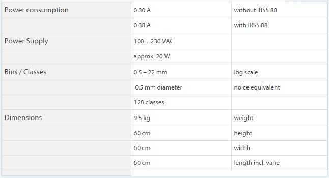 - The high dynamic range allows resolving 128 size bins with logarithmic increase in size from 0.1 to 22 mm in diameter.