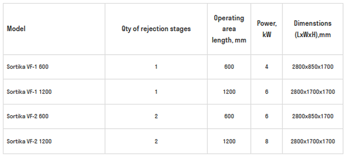 Sortika VF optical separator provides separation of recyclables (cullet, WEEE, mixed metals) and minerals (talc, magnesite, limestone, quartz) with particle size from 5 to 100 mm with separation efficiency up to 99.99%.