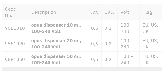 A dispenser with a reagent recirculation system for motor-powered dispensing directly from the reagent bottle. Available in three volumes (10 ml, 20 ml and 50 ml). Simplify the laboratory routine while still working with high precision – the opus® dispenser combines functionality and user-friendliness with functional reliability and efficiency. Serial dispensing procedures with consistent reliability of results can also be realised through electronic control – up to 9999 times if required. A standard stepper function enables the dispensing of several partial volumes (which may vary) from a single cylinder charge. Sophisticated details facilitate control. The dispensing procedure is configured on the intuitive TFT touchscreen. The user is guided through menu functions which are easily legible and comprehensible. Nine different dispensing procedures with their complete settings can be saved in the method memory and reactivated at any time if required.