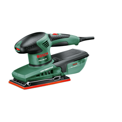 Smooth high-quality surfaces can be achieved quickly with the PSS 250 AE orbital sander. The powerful 250 W motor is ideal for handling a wide range of sanding jobs. Low vibration and an ergonomic design combined with the options of one- or two-handed guidance provide a comfortable working experience. Electronic speed preselection enables speeds to be matched to the needs of each job and material. It is designed for completing sanding tasks on medium-sized wooden, painted, and varnished flat surfaces, as well as filler, metal, stone, and plaster. The Microfilter dust box reduces dust.