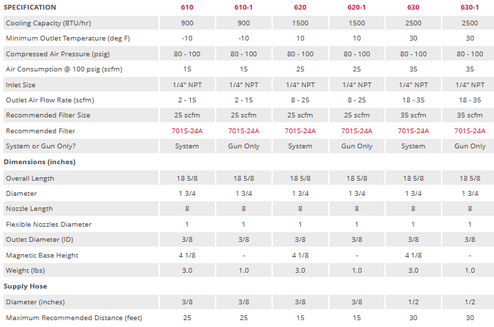 • Creates cold air up to 100 F deg (+ 56 C deg) below the inlet compressed air temperature