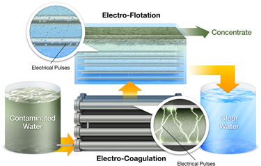 1. Electro-Coagulation: contaminated water enters the first stage, which is a proprietary electro-coagulation process. In this stage, a mild electrical field is applied in specifically designed long tubes, causing the contaminants to coagulate, or “clump” together.