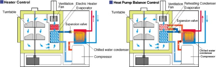 So far, existing low-temperature chambers have generally carried out temperature stability control by being cooled through a refrigeration circuit and heated with an electric heater. ORION`s originally developed Heat Pump Balance Control※1 is the ideal temperature control system which achieves wide ranging energy savings by doing away with a temperature control heater, and instead utilizing latent heat produced from the cooling process to achieve temperature control. We have achieved the greatest level of energy savings in the world for cooling chambers of 30 ℃ or lower by utilizing our Heat Pump Balance Control.