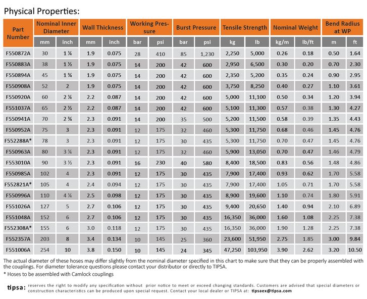 Chemical Resistance:Exposure to seawater and contamination by most chemical substances, hydrocarbons, oils, and greases has no effect on the short or long term performance of the hose. A chemical resistance chart is available and TIPSA will supply specific chemical resistance data when requested by the purchaser for unique applications.