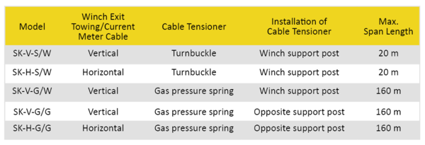 - Gas pressure spring tensioner (for span lengths > 20 m) – compensates for temperature effects and eliminates manually re-tensioning or releasing the cable tension; free of oil and environmentally compatible – no oil will get into the water