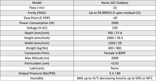 High Purity Nitrogen Delivered As and When Required. Utilising Pressure Swing Adsorption technology the Apex Nevis series provides ideal performance, efficiency and reliability. High purity nitrogen is delivered as and when required. Featuring an integral Jun Air compressor each Nevis-C Generator provides a true stand-alone solution. All models in the range are mobile to allow easy repositioning and installation. For Outdoor use our Nevis Nitrogen Generators can be built into an alternative weather proof enclosure. The Enclosure is rated as providing IP54 protection, keeping your generator safe from rain and most dust.