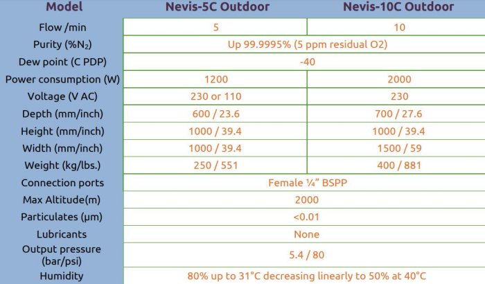 Featuring an integrated Air compressor each Nevis-C Generator provides a true stand-alone solution. All models in the range are mobile to allow easy repositioning and installation. For Outdoor use our Nevis Nitrogen Generators can be built into an alternative weather proof enclosure. The Enclosure is rated as providing IP54 protection, keeping your generator safe from rain and most dust. Our standard Nevis Outdoor has a flow rate of 10 l/min, and an output pressure of 5.4 bar / 80 psi will producing high purity nitrogen of 99.9995% although like most of our products; flow rates, pressure and purity can all be customised.