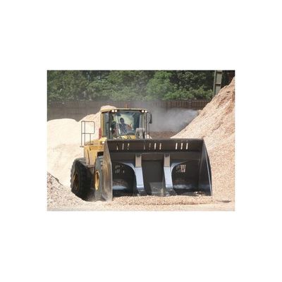 - A bulk front loader working in a biomass yard. Personnel and equipment are protected from dust by mist-air and stock pile material remains dry.