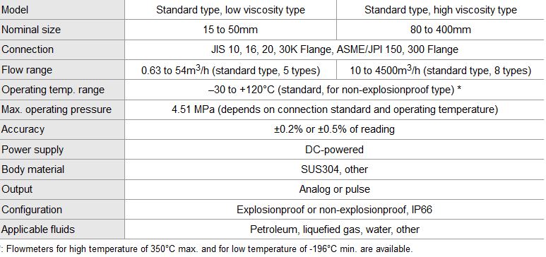 A turbine flowmeter for industry application that allows stable high accuracy measurement for the liquid with a wide range of viscosity including low Reynolds number area. It is suited mainly for petroleum, liquefied gas, and water flowrates.