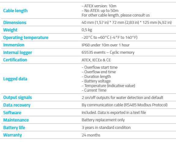 The Hydreka overflow detector has the following features: