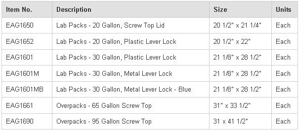 Safely contain, store, and transport drums holding a wide range of hazardous materials, including acids and corrosives. Constructed of lightweight high-density polyethylene that is chemical resistant and includes UV inhibitors. Nestable. Choose from plastic lids with metal or plastic locking bands or plastic screw on lids. Lab Packs are for containment of smaller containers, Overpacks are ideal for use with larger drums. Containers incinerate completely when used with the plastic locking lever or screw-on lid. Can be used with packing groups I, II, and III of hazardous materials. UN certified HM-181; DOT 49 CFR 173.3. Yellow (unless specified otherwise).