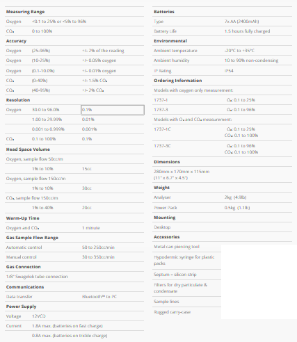 The Novatech 1737 analysers are available for oxygen only, or for both CO₂ and oxygen with two oxygen ranges. The instruments can be selected with a pump where samples need to be aspirated, and with accessories (see reverse side) including: