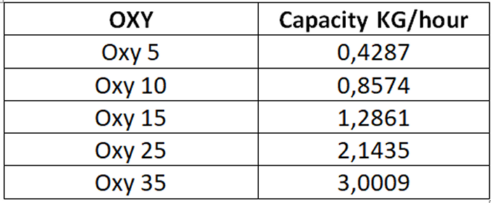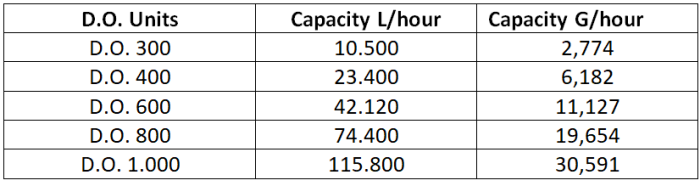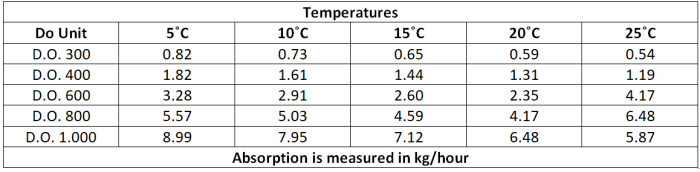 Oxygen absorption specifications for the units with the water at 2.5 bar and various temperatures.