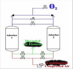 The Oxygen generator takes air and separates the oxygen from other gasses. The separation is accomplished with an inert ceramic material that does not require replacement (when maintained and used according to this instruction manual). The process is completely regenerative which makes it reliable and virtually maintenance free. The delivery pressure can be set from 0 to 4,0 bars (g) to meet the needs of your operation.