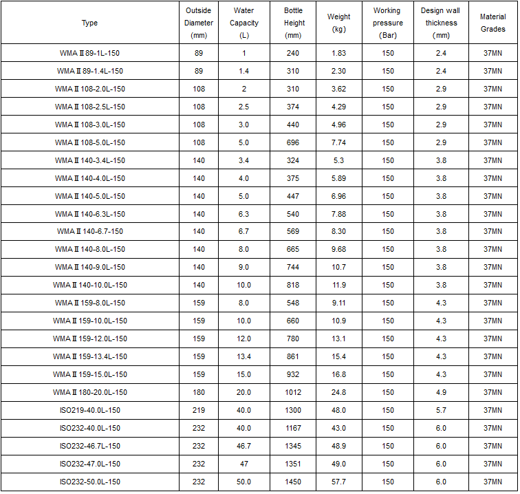 - 0.8 litres to 80 litres; 89mm-267mm cylinder outer diameter; Working pressure is 150bar; Hydrostatic test pressure is 250bar; 37 mn material; Iso9809-3 or GB/T5099.3 production standards;