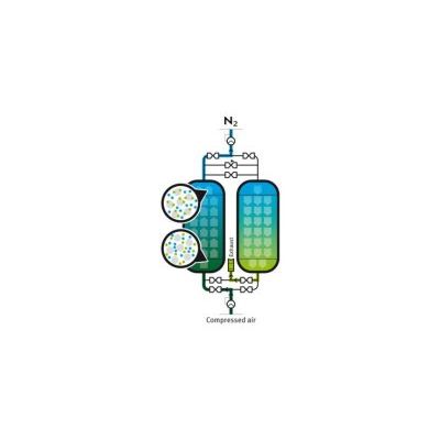 At Oxymat, we use two columns with molecular sieves to ensure continuous production. Dry compressed air is blown through a valve to the vessel where the pressure is built to reach 5 to 7 bar(g). Oxygen is tied to a molecular sieve during the building of pressure, and the nitrogen is allowed to pass through to the accumulation tank. While pressure is build in one vessel, the second remains without pressure. A part of the produced gas is used for regeneration of the molecular sieve. For Nitrogen a Carbon Molecular Sieve (CMS) is used. The molecular sieve is fully regenerative and has a life span on to 40.000 operation hours.
