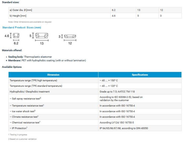 OxySeal pressure compensation units with hydrophobic membranes are used for ventilation purposes where water needs to be reliably retained, and a gas exchange or pressure compensation is needed at the same time. OxySeal pressure compensation units are a plug-in solution for housings having inverted cylindrical openings. Each unit consists of a hydrophobic track-etched membrane that has been injection-molded with a thermoplastic elastomer seal, which keeps the unit in the opening without any additional anchor or fastener. OxySeal units are customizable according to the specific requirements of the customer, including the selection of the dimensions, membrane technology, and the form of the pressure compensation elements.