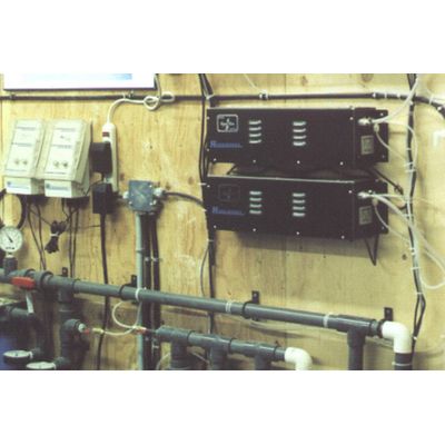 Whole House ozone water treatment system with High Frequency Corona Discharge ozone generation using concentrated oxygen. Remote alarm notification (optional). Interface to PC for continuous monitoring (optional). Filter change sensing & indication (optional).