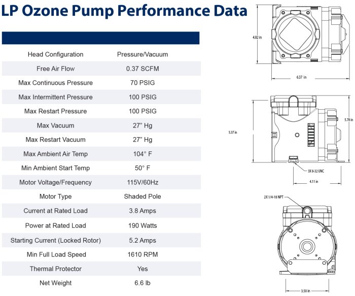 LP ozone Pump is completely oil-less and comes with our relentless commitment to quality, performance, and overall service to our customers. Our business mindset is to provide customers with exactly what they require. Flexible component and product designs allow for a wide range of customization inflow and pressure performance, input power, port locations, accessories, and more!