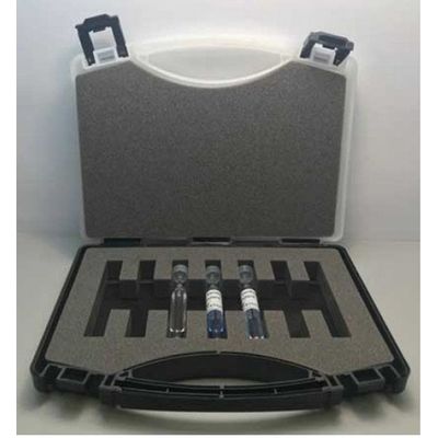 The I-7433 Verification Kit is intended for customers who use CHEMetrics Ozone Vacu-vials Kit, Catalog No. K-7433 and would like to verify the performance of the CHEMetrics I-2022 Ozone SAM (Single Analyte Meter). Each kit is packaged in a compact, durable polypropylene carrying case and includes a set of ampoules containing various dye solutions specific to the wavelength of the I-2022 SAM. The absorbance of each dye ampoule is individually confirmed using a spectrophotometer that is certified using optical standards traceable to NIST. A Certificate of Conformance is supplied with each kit that reports the range of permissible test values for each standard in the kit.