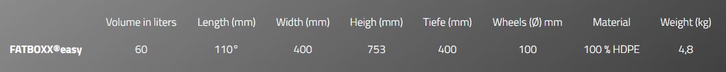 • The FATBOXX®easy is particularly mobile thanks to integrated wheels and, with a height of 76 cm, fits under any counter or kitchen unit.