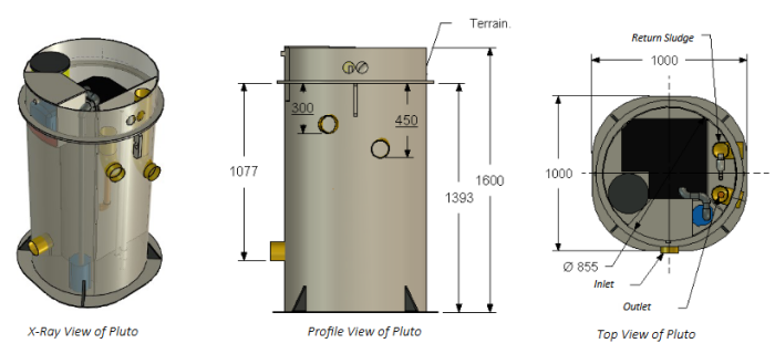 The Pluto Systems are typically installed in ground after a septic tank. The septic tank should be supplied locally from one of many standard suppliers. Alternatively it can be casted on site in concrete.