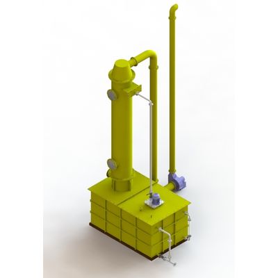 In the vertical counter-current design, gas flows upward while scrubbing liquid flows down through banks of sprays. The absorption of gases takes place in the scrubber random packing section and scrubbing liquid is introduced into a liquid through or spray distribution system. A high-efficiency mist eliminator removes entrained liquids. Clean gas exists at the top of the vessel.