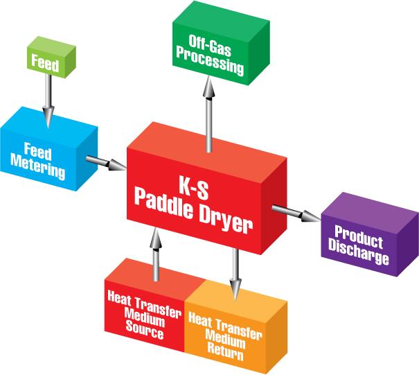 Safety features must be part of the system design. The K-S Paddle Dryer operates with an inert low temperature environment. Air is not used to convey a hot product in the dryer. Off-gas can be recycled after volatiles are condensed.