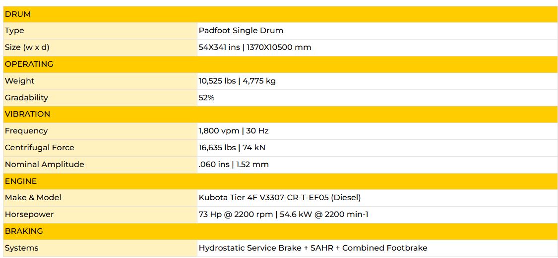 The SV204T padfoot single drum vibratory soil compactor is engineered for superior performance in cohesive and semi-cohesive soils where deep, kneaded compaction is essential. Ideal for materials like clay, clay-rich soils, silt, and mixtures of clay with sand or silt, this 10,220 lb compactor, powered by a reliable Kubota diesel, offers an exceptional high power-to-weight ratio. Its excellent traction, delivered by a limited-slip hydraulic drive, no-slip axle, and rugged tractor tires, ensures consistent compaction on demanding grades up to 52%, making it perfect for low to medium production site work and large trench compaction.