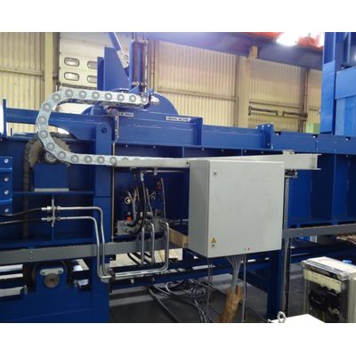 The log pusher conveys the packages of wood from an OSB system to the chipper. In conventional Design, the sign of the logpusher is moved up and down by driving through deflections. With the new Logpusher, the blade is moved hydraulically and can therefore be moved up and down in any position.