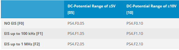 The PalmSens4 is available with ±5V or ±10V DC-potential ranges and with different maximum frequencies for FRA / EIS. The following table shows the applicable product codes: